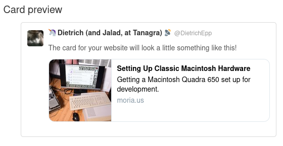 I care about being able to share links with people on places like Twitter, Facebook, and Discord. Adding Open Graph metadata means that your links get shared as a “card”, with an image, title, and description. With Open Graph metadata, sharing a link to your website looks like this: